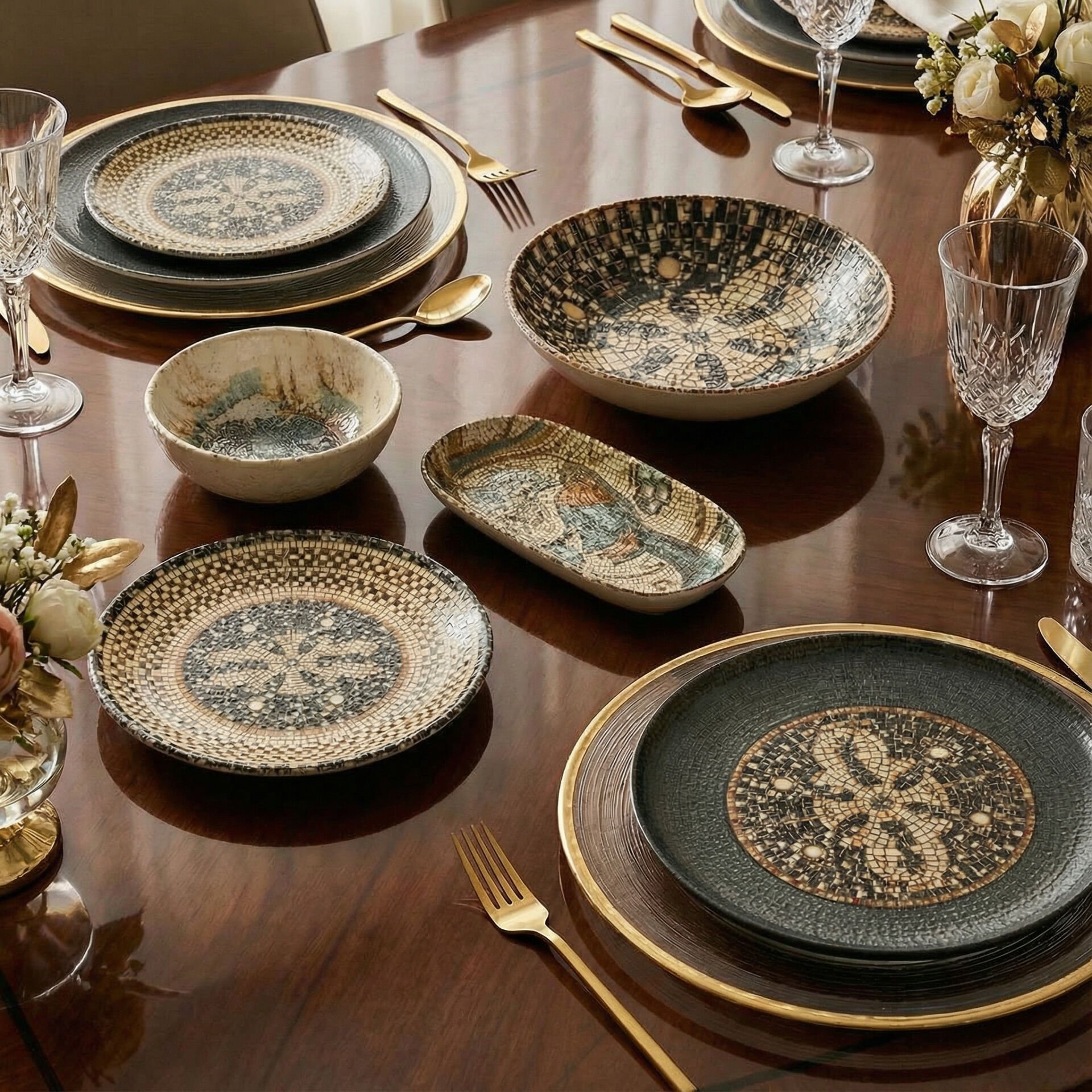 Mezopotamya’nın kadim motiflerinden ilham alan özgün tasarımıyla sofralarınıza güçlü bir karakter kazandırır. Doğal tonlar, etnik desenler ve modern çizgilerin dengeli birleşimi sayesinde hem günlük kullanıma hem de özel davet sofralarına şıklık katar.