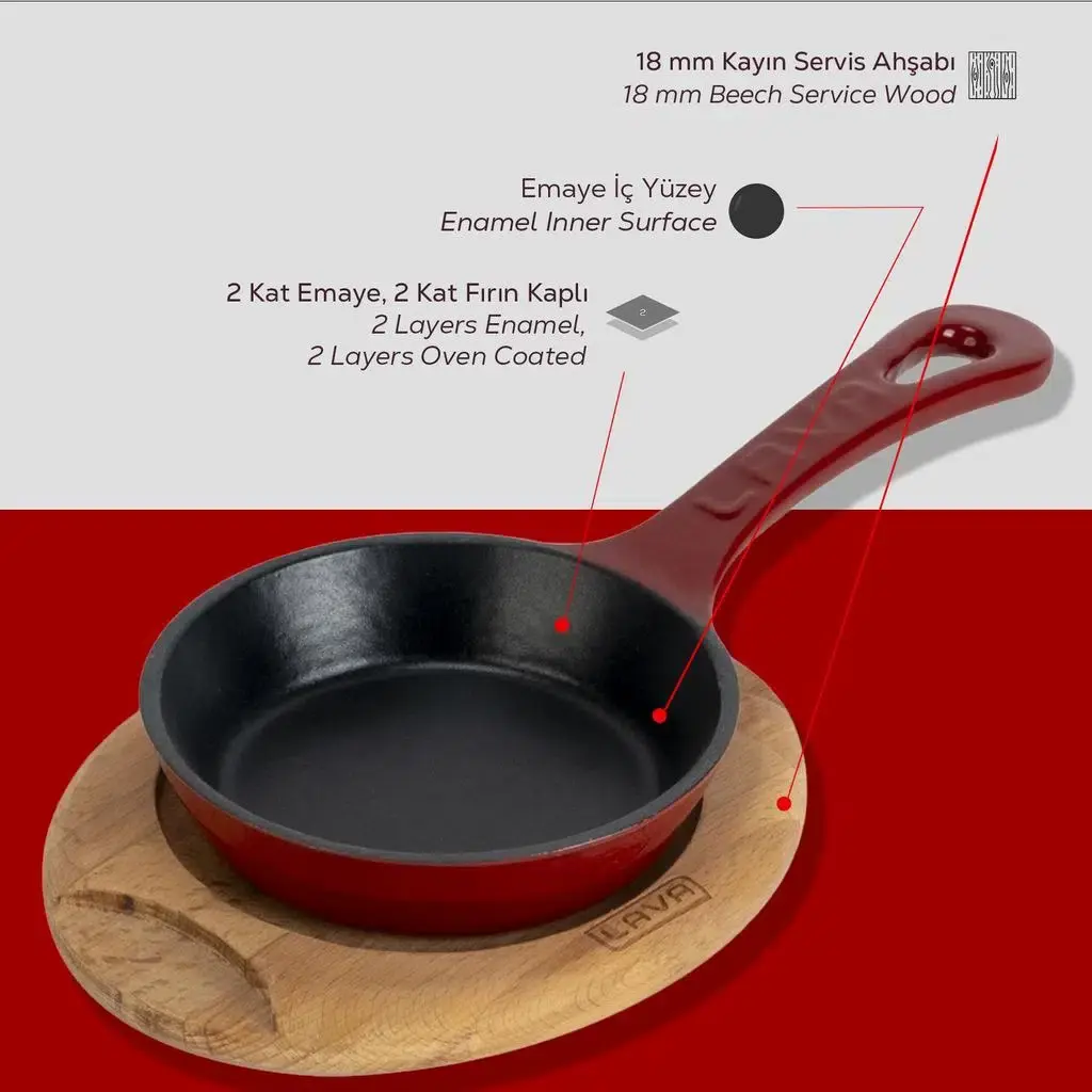 Yekpare döküm saplı tasarımı sağlam ve güvenli bir kullanım sunarken, tava ile birlikte kullanılan kayın ahşap servis sunum tahtası sıcak sunumlar için hem estetik hem de işlevsel bir çözüm sunar. Tavanın ölçülerine uygun olarak tasarlanan ahşap servis altlığı, döküm tavayı doğrudan masaya getirmenize olanak tanır ve masayı sıcak yüzeyden korur. Doğal kayın ağacından üretilen servis tahtası, rustik ve şık bir sunum görünümü sağlayarak sofralara farklı bir sunum deneyimi kazandırır.