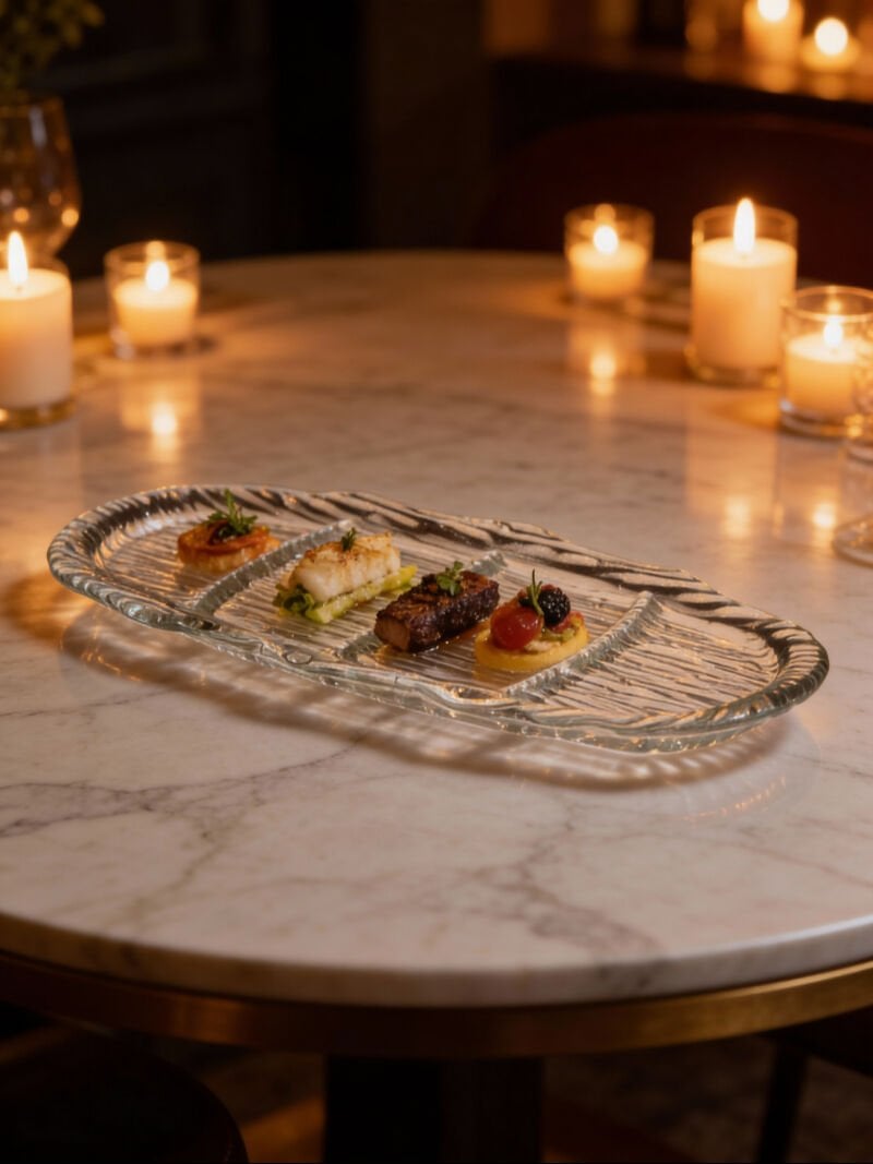 Yüksek kaliteli cam malzemeden üretilen sunum tabağı, geniş ölçüsüyle sofralarda dikkat çekici bir alan oluşturur. Bölmeli yapısı, tatların birbirine karışmasını önlerken profesyonel ve estetik sunumlar yapmanıza yardımcı olur. Şeffaf cam tasarımı sayesinde sunulan ürünler ön plana çıkar ve her masa konseptiyle uyum sağlar.
